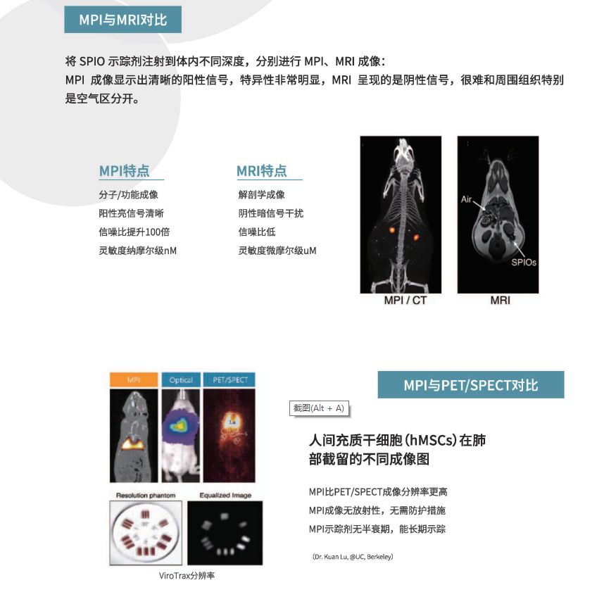MPI磁粒子小动物活体成像性能优势 1. 易转化到人,用临床SPIO示踪剂。 2. Nm级灵敏度,可检测个位数细胞。 3. Mm级分辨率,目前达到0.3mm。 4. 信号不随深度衰减,3D断层扫描。 5. 可以长达数个月的连续示踪成像。 6. SPIO无毒无放射,代谢成血红素。 7.定量分析。 主要应用 多模态成像;活体成像;干细胞及各种类细胞示踪;肿瘤检测示踪(肿瘤微环境/肿瘤免疫微环境);免疫炎症示踪;心脑血管成像;血管灌注成像;准确靶向磁热疗;准确靶向药物输送;肿瘤免疫治疗(局部免疫刺激);纳米粒子开发。 肿瘤免疫治疗是全球趋势 临床应用前景 1.得到美国NIH的资金支持,正在合作研发可用于临床的MPI. 2. 区别于CT、MRI、和PET等,MPI成像没有任何辐射,不需要使用任何有毒性的示踪剂。使用临床许可的超顺磁性氧化铁纳米颗粒(SPIO):安全性通过临床审查,特别是可用于肾功能不全或肾脏损伤的病人。 3. SPIO这种纳米尺寸的氧化铁粒子在体内可以分解并转化为血红素,完全的支持长期诊断检测,无任何累计辐射或毒性。 |